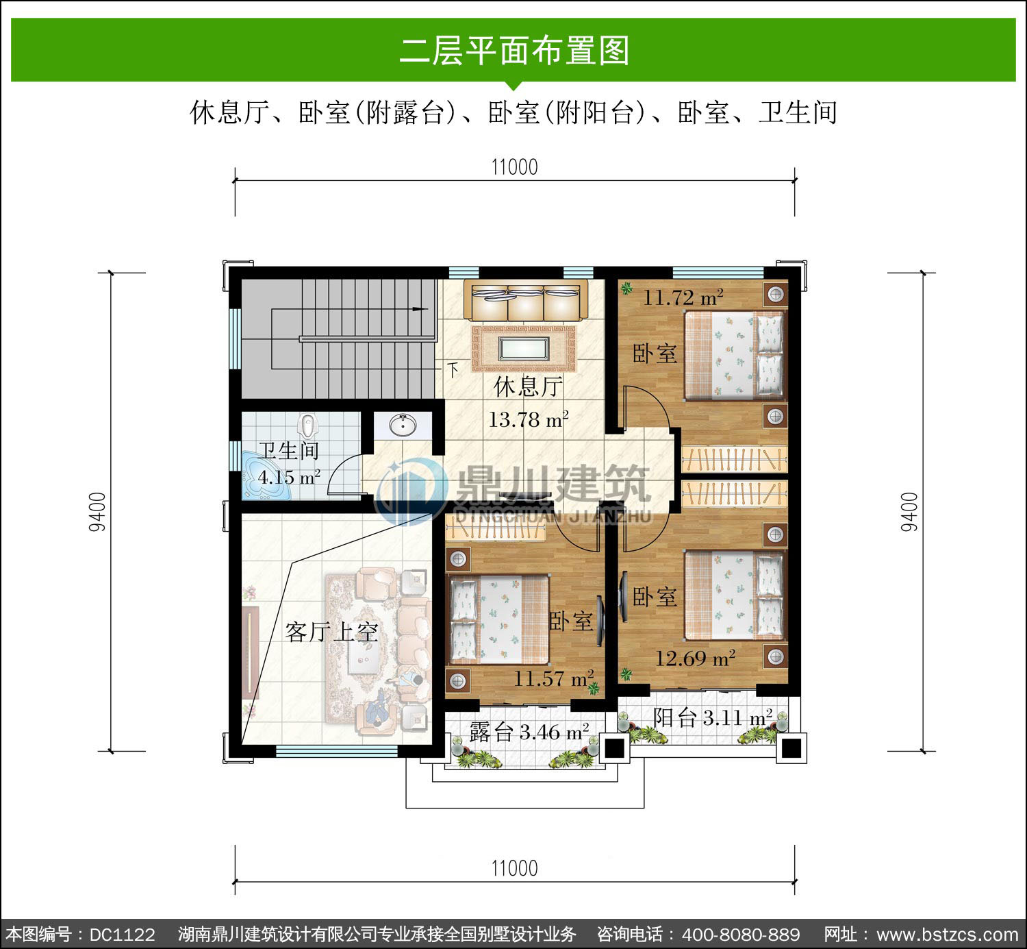 | 二 層: | 休息廳、臥室(附露臺)、臥室(附陽臺)、臥室、衛生間 | |||