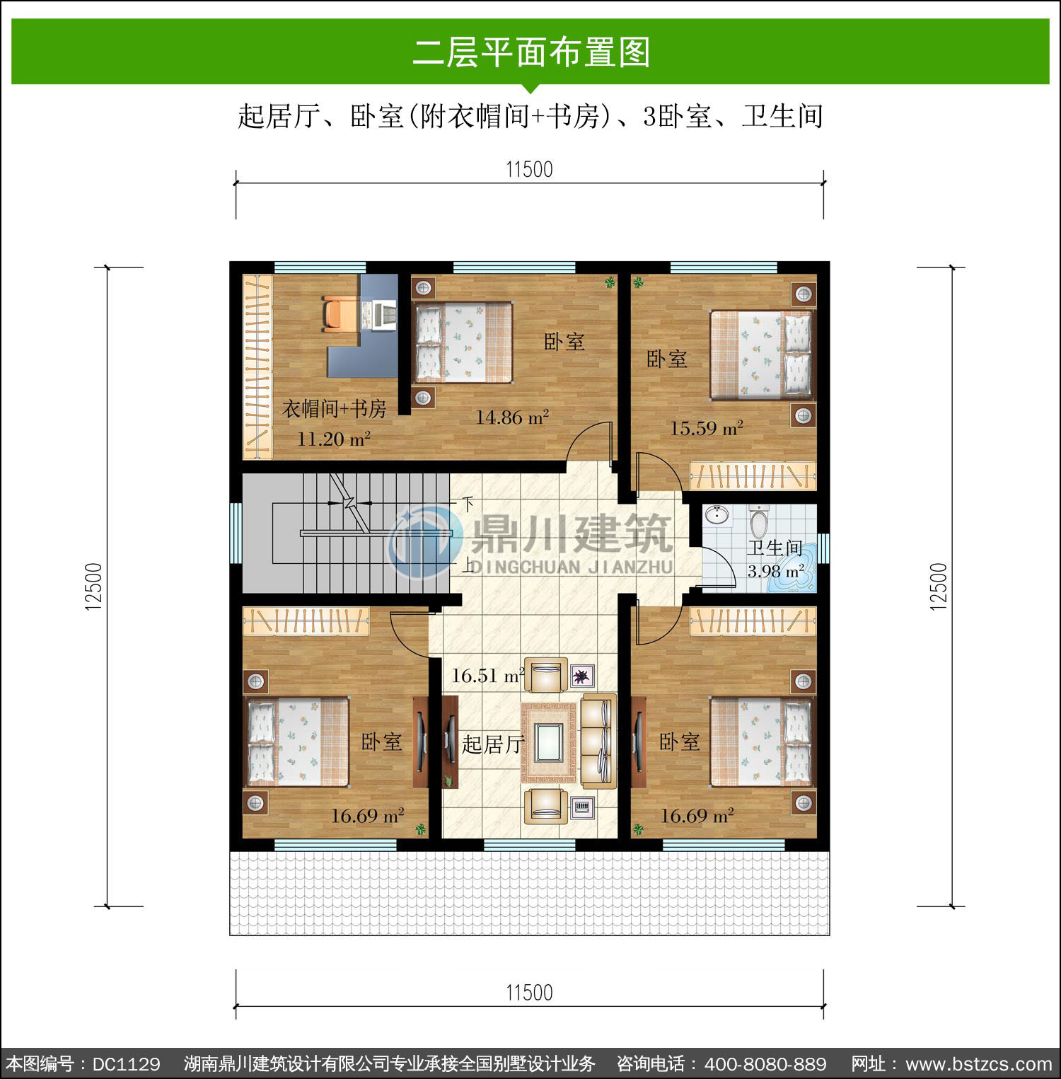 | 二 層: | 起居廳、臥室(附衣帽間+書房)、3臥室、衛(wèi)生間 | |||