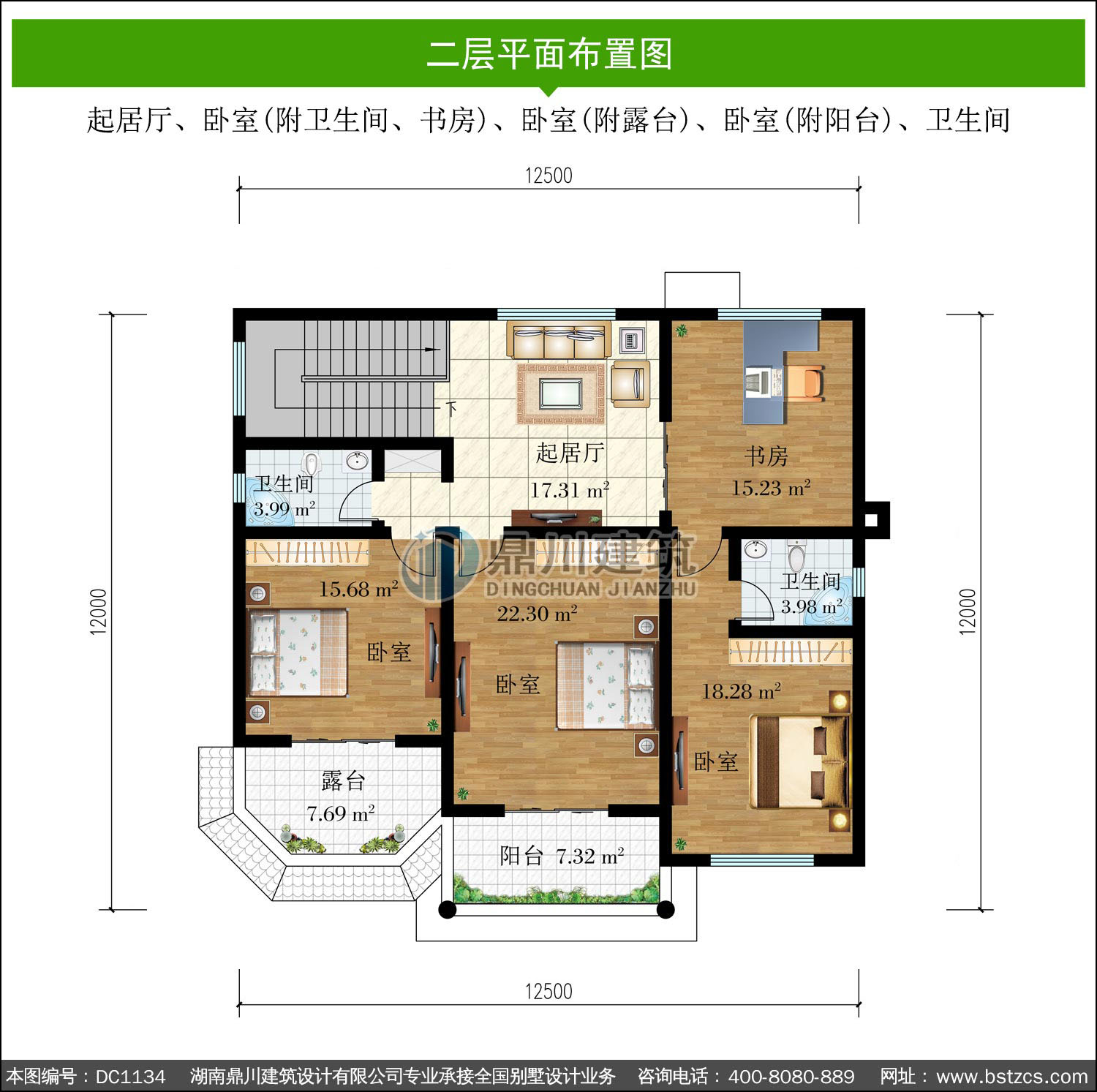 | 二 層: | 起居廳、臥室(附衛生間、書房)、臥室(附露臺)、臥室(附陽臺)、衛生間 | |||