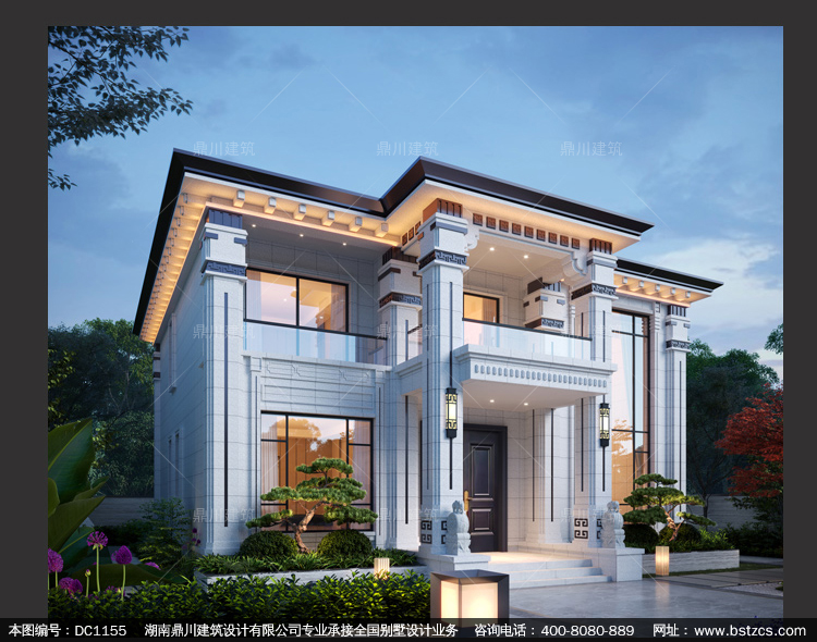 新中式二層帶陽臺別墅圖紙及效果圖_農村自建別墅設計,鼎川建筑