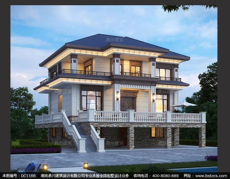新中式二層帶架空層別墅圖紙及效果圖_新農村自建別墅設計,鼎川建筑