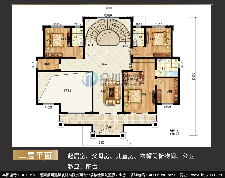 | 二 層: | 起居室、父母房、兒童房、、衣帽間、儲物間、公衛(wèi)、私衛(wèi)、陽臺 | |||