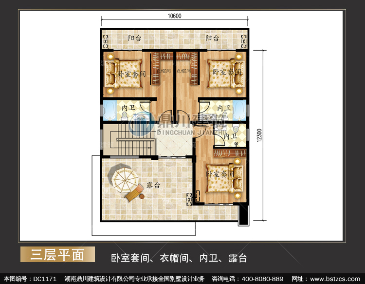 | 三 層: | 臥室套間、衣帽間、內衛、露臺 | |||