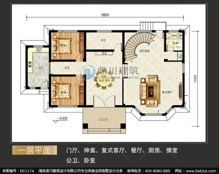 | 一 層: | 門廳、神龕、復式客廳、餐廳、廚房、佛堂、公衛(wèi)、臥室 | |||