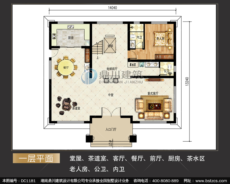 | 一 層: | 堂屋、茶道室、客廳、餐廳、前廳、廚房、茶水區、老人房、公衛、內衛 | |||