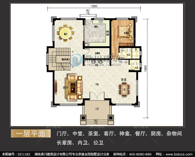 | 一 層: | 門廳、中堂、茶室、客廳、神龕、餐廳、廚房、雜物間、長輩房、內衛、公衛 | |||
