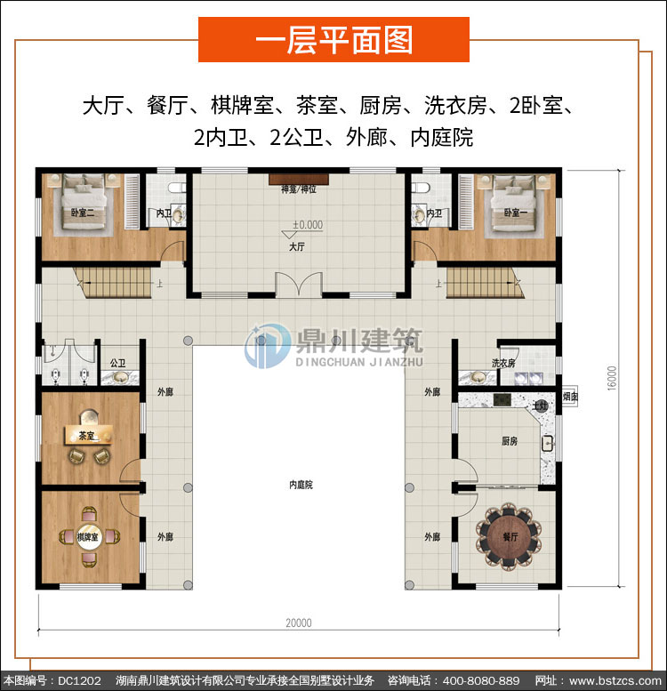 | 一 層: | 大廳、餐廳、棋牌室、茶室、廚房、洗衣房、2臥室、2內衛、2公衛、外廊、內庭院 | |||