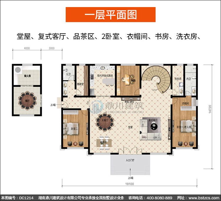 | 一 層: | 堂屋、復式客廳、品茶區、2臥室、衣帽間、書房、洗衣房、2衛生間、儲藏室、開放式廚房、柴火房、2餐廳 | |||