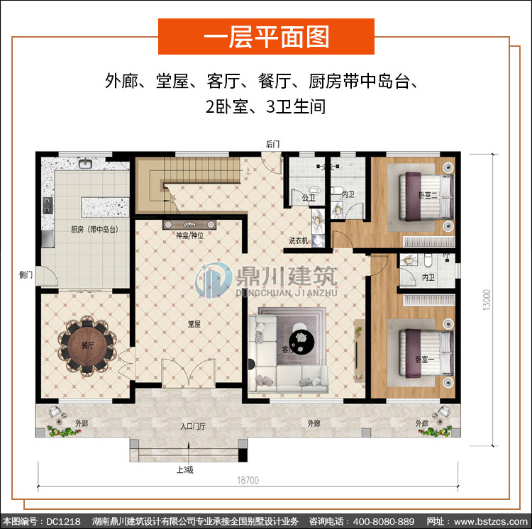 | 一 層: | 外廊、堂屋、客廳、餐廳、廚房帶中島臺、2臥室、3衛生間 | |||