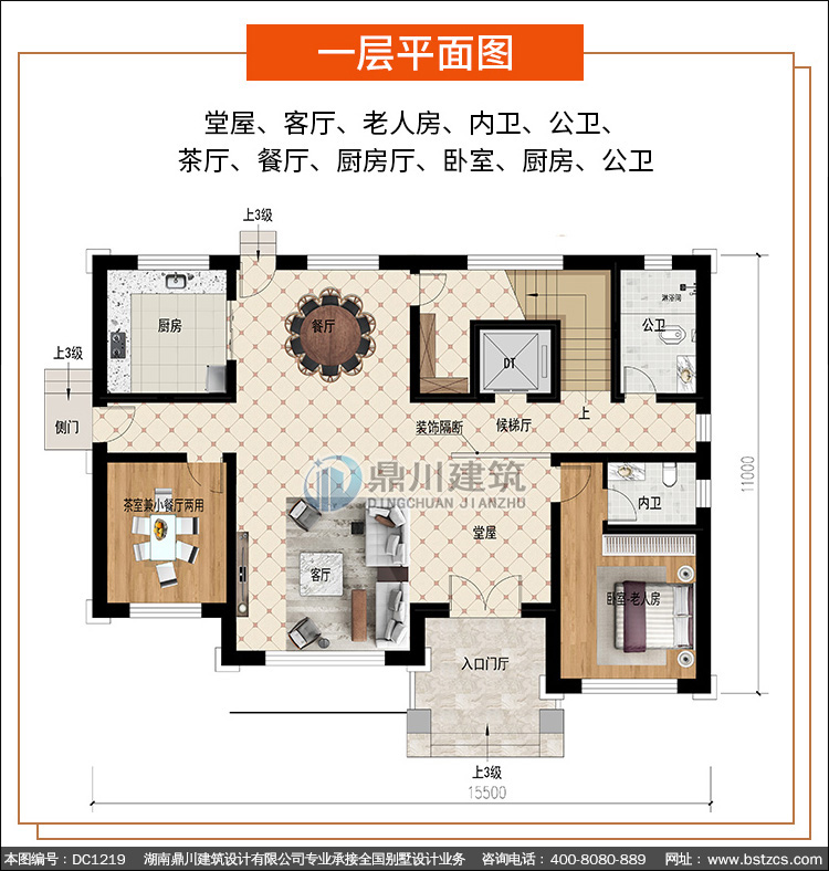 | 一 層: | 堂屋、客廳、老人房、內衛、公衛、茶廳、餐廳、廚房廳、臥室、廚房、公衛 | |||