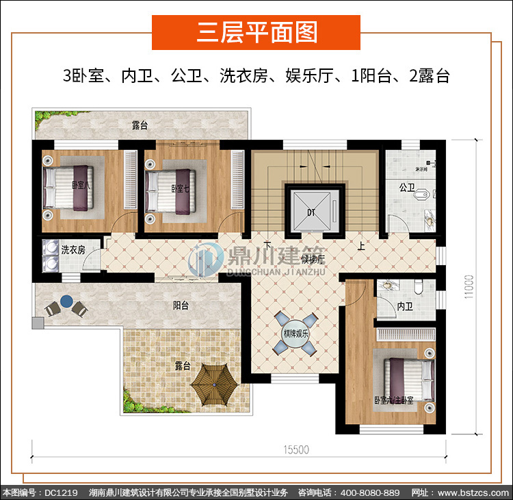 | 三 層: | 3臥室、內衛、公衛、洗衣房、娛樂廳、1陽臺、2露臺 | |||