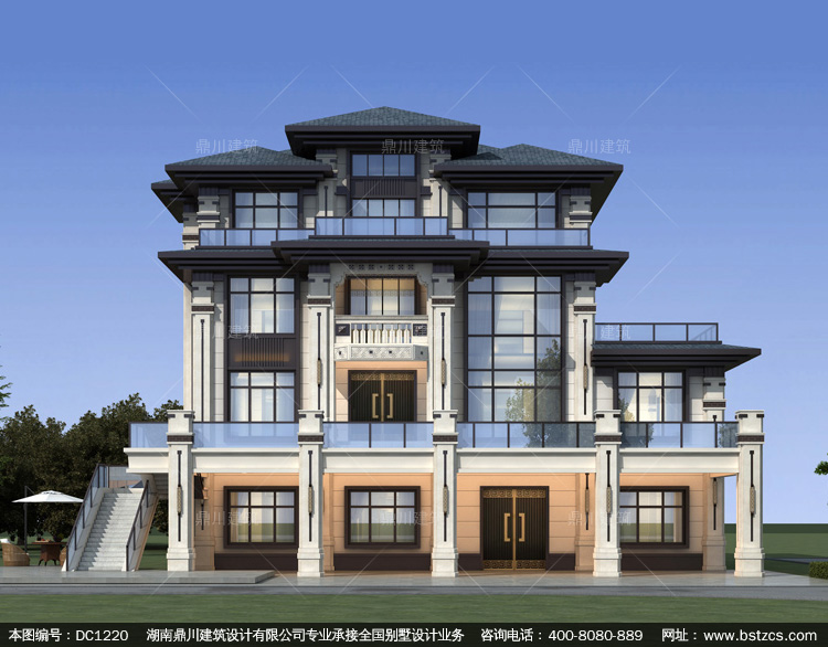 大氣新中式三層別墅施工圖紙及效果圖_新農村自建別墅設計,鼎川
