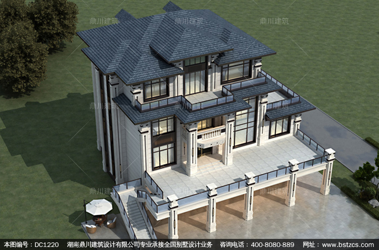 新中式二層帶架空層別墅圖紙及效果圖_新農村自建別墅設計,鼎川