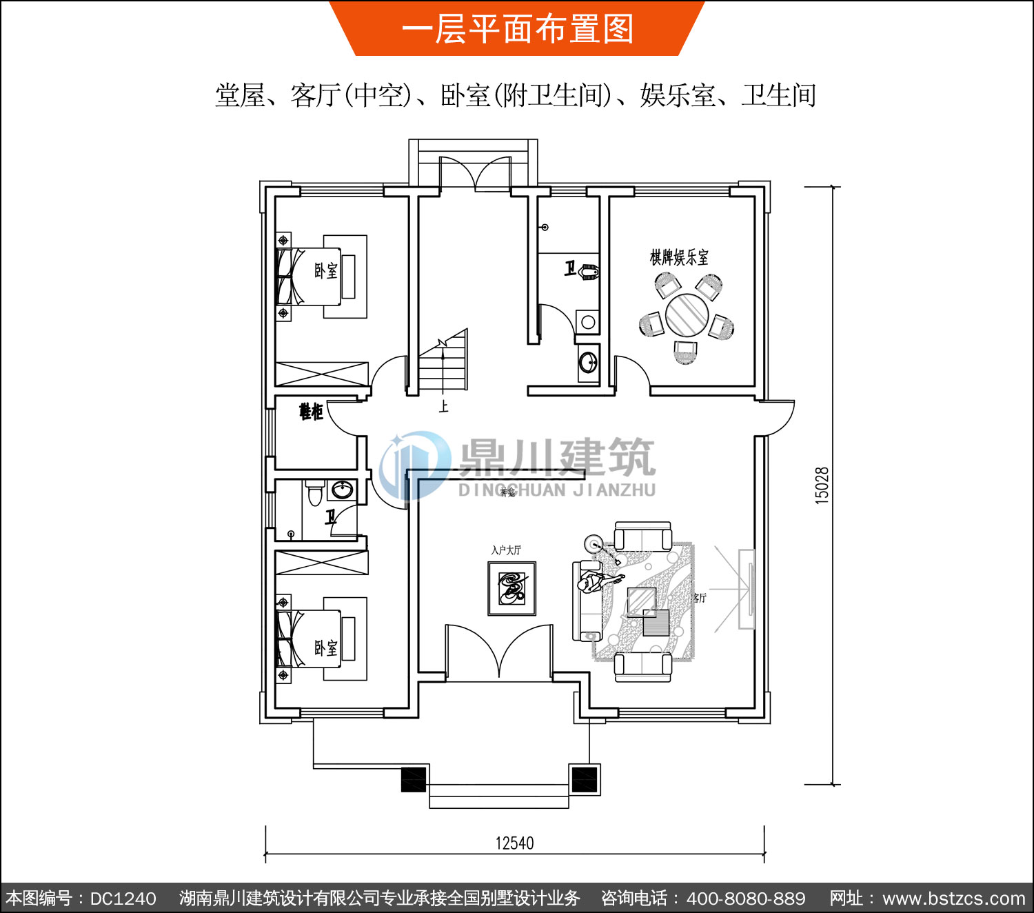 | 一 層: | 堂屋、客廳(中空)、臥室(附衛生間)、娛樂室、衛生間 | |||