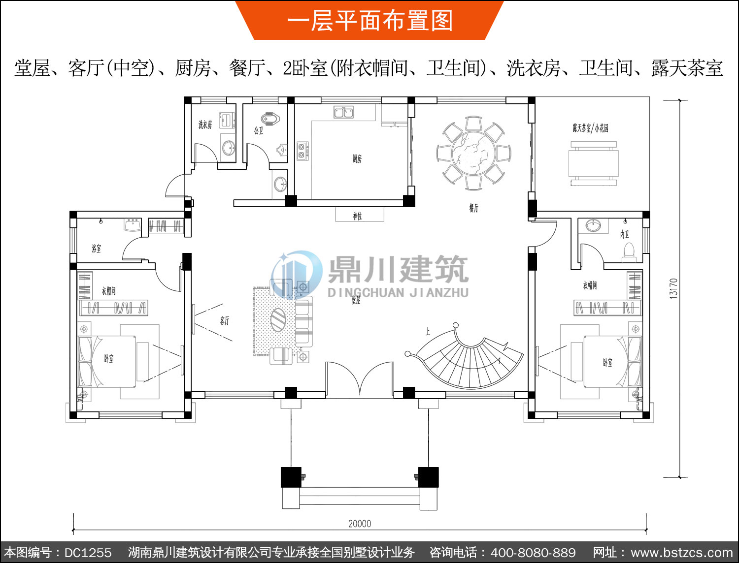 | 一 層: | 堂屋、客廳(中空)、廚房、餐廳、2臥室(附衣帽間、衛生間)、洗衣房、衛生間、露天茶室 | |||
