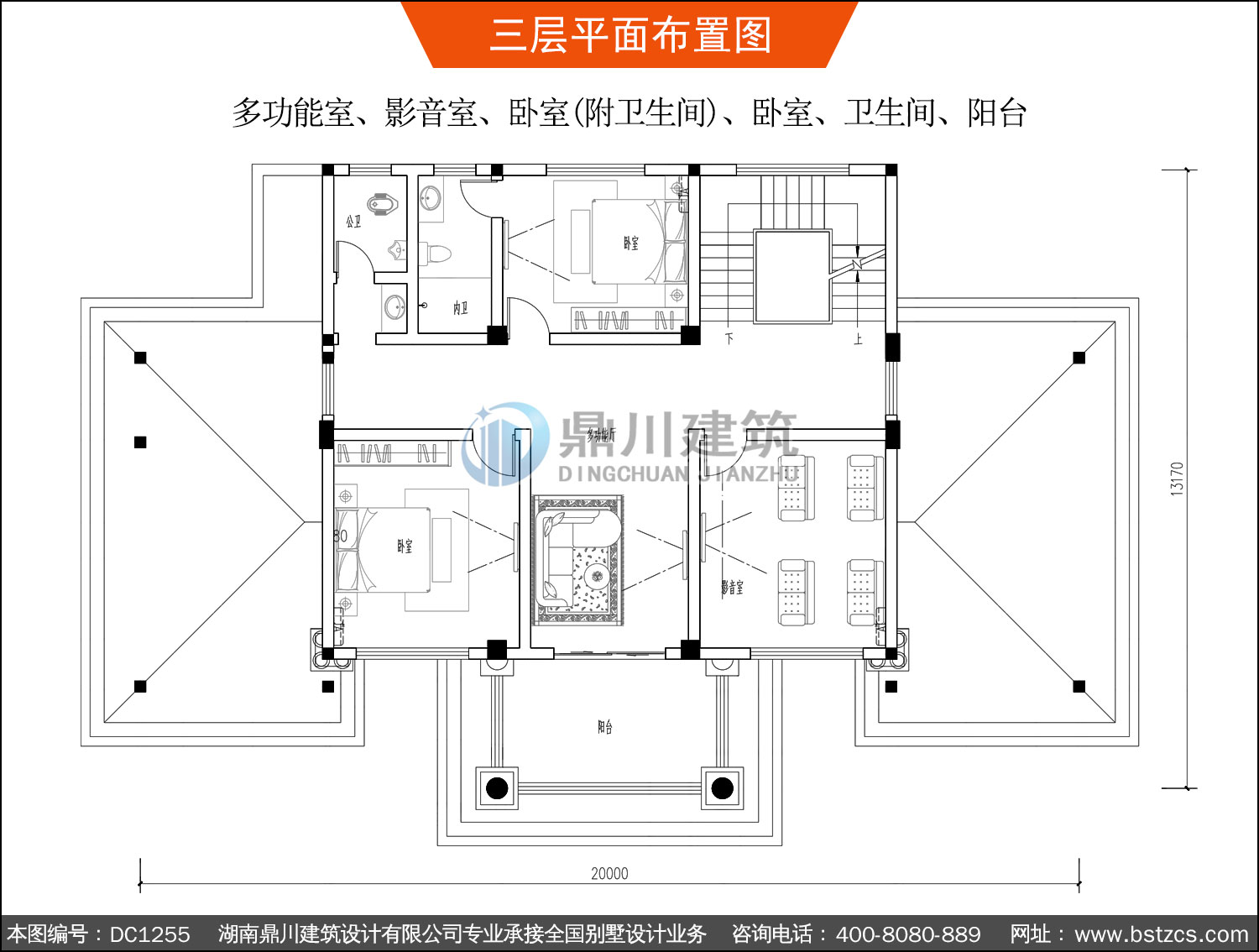 | 三 層: | 多功能室、影音室、臥室(附衛生間)、臥室、衛生間、陽臺 | |||
