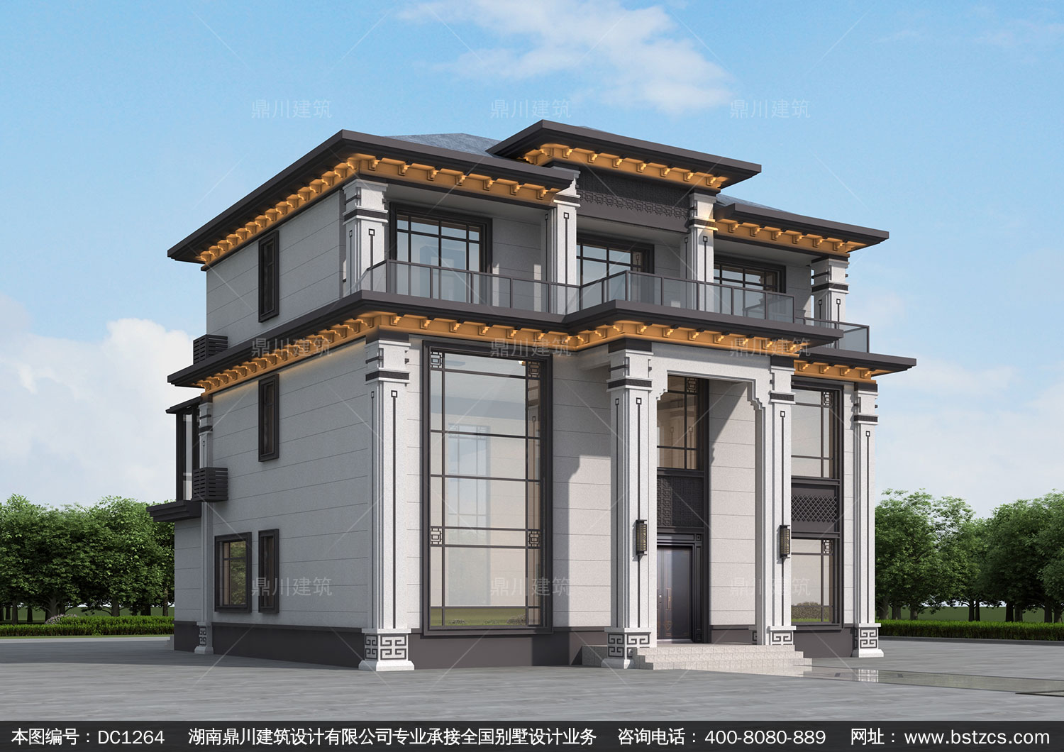 新中式三層帶露臺別墅圖紙效果圖_農村自建別墅設計,鼎川建筑