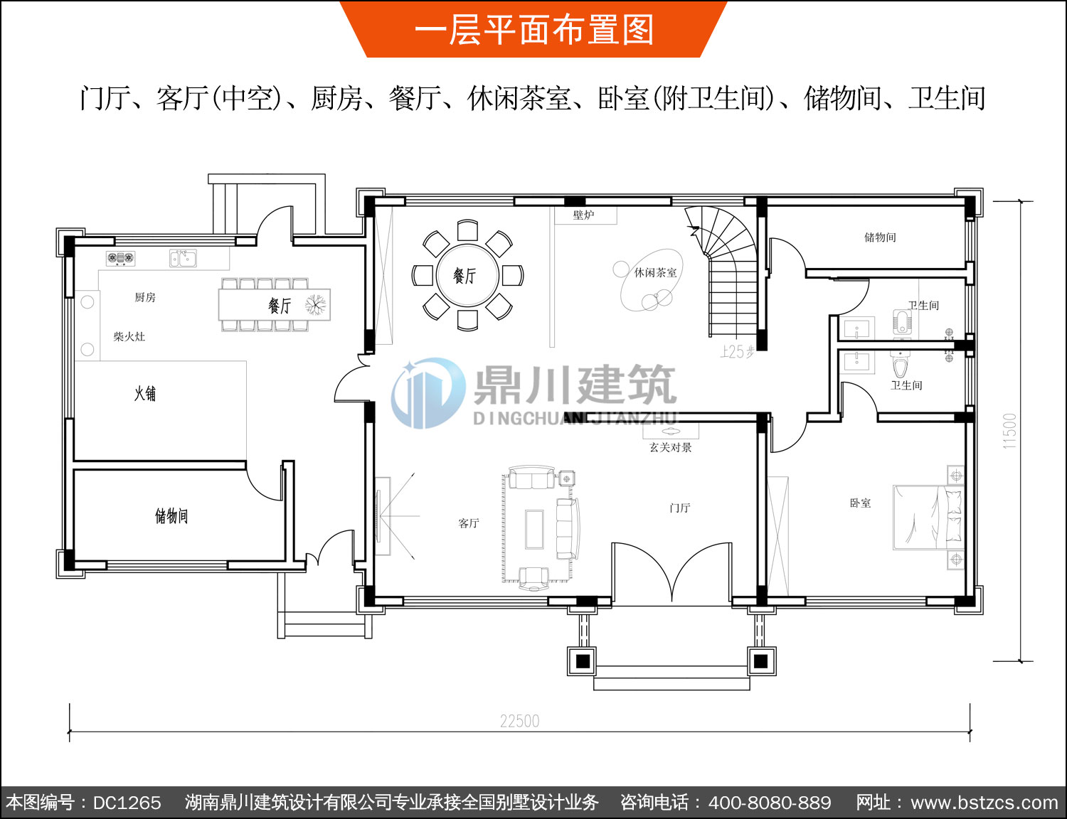 | 一 層: | 門廳、客廳(中空)、廚房、餐廳、休閑茶室、臥室(附衛(wèi)生間)、儲物間、衛(wèi)生間 | |||