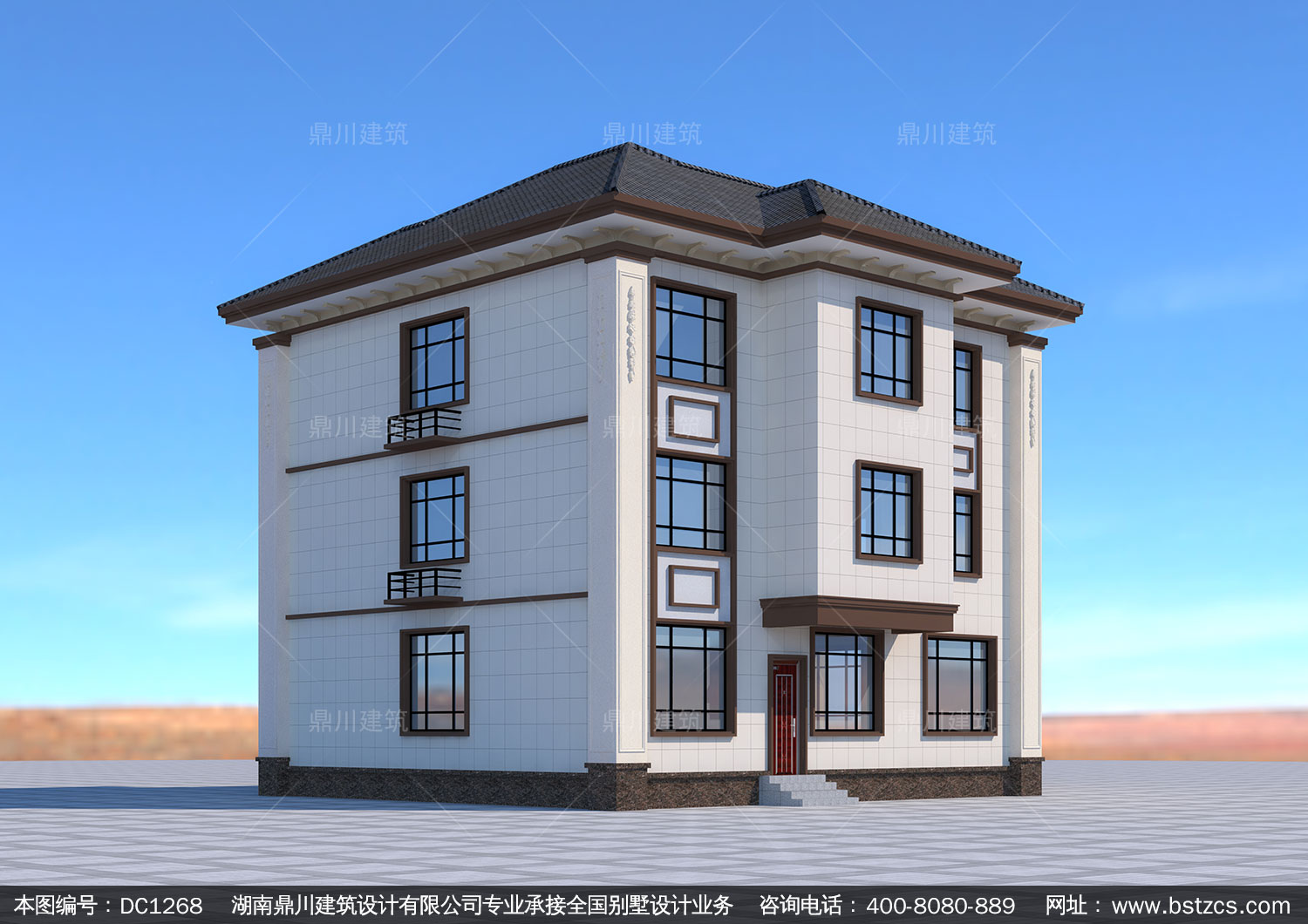 新中式三層帶露臺別墅圖紙效果圖_農村自建別墅設計,鼎川建筑