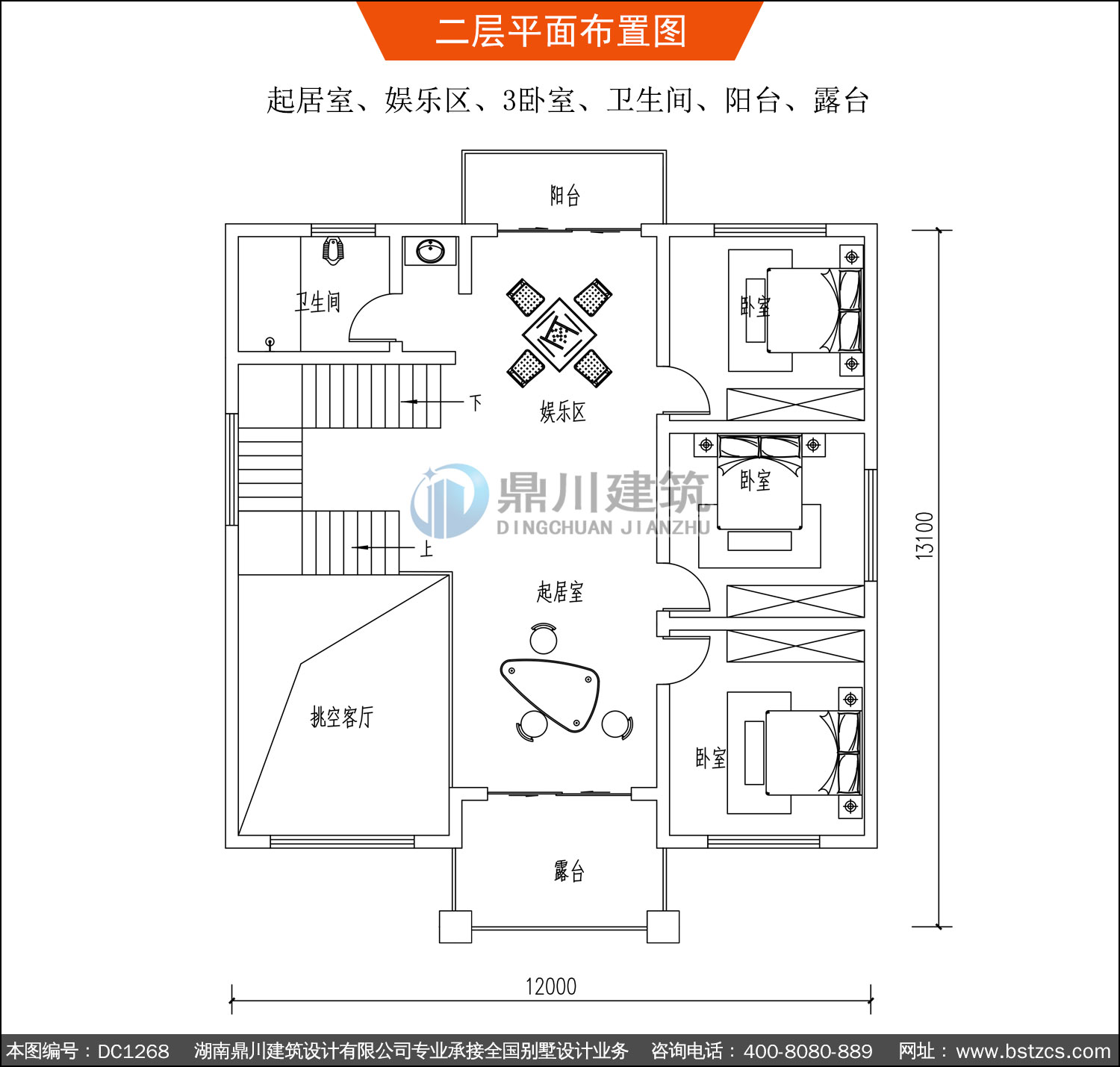 | 二 層: | 起居室、娛樂區、3臥室、衛生間、陽臺、露臺 | |||