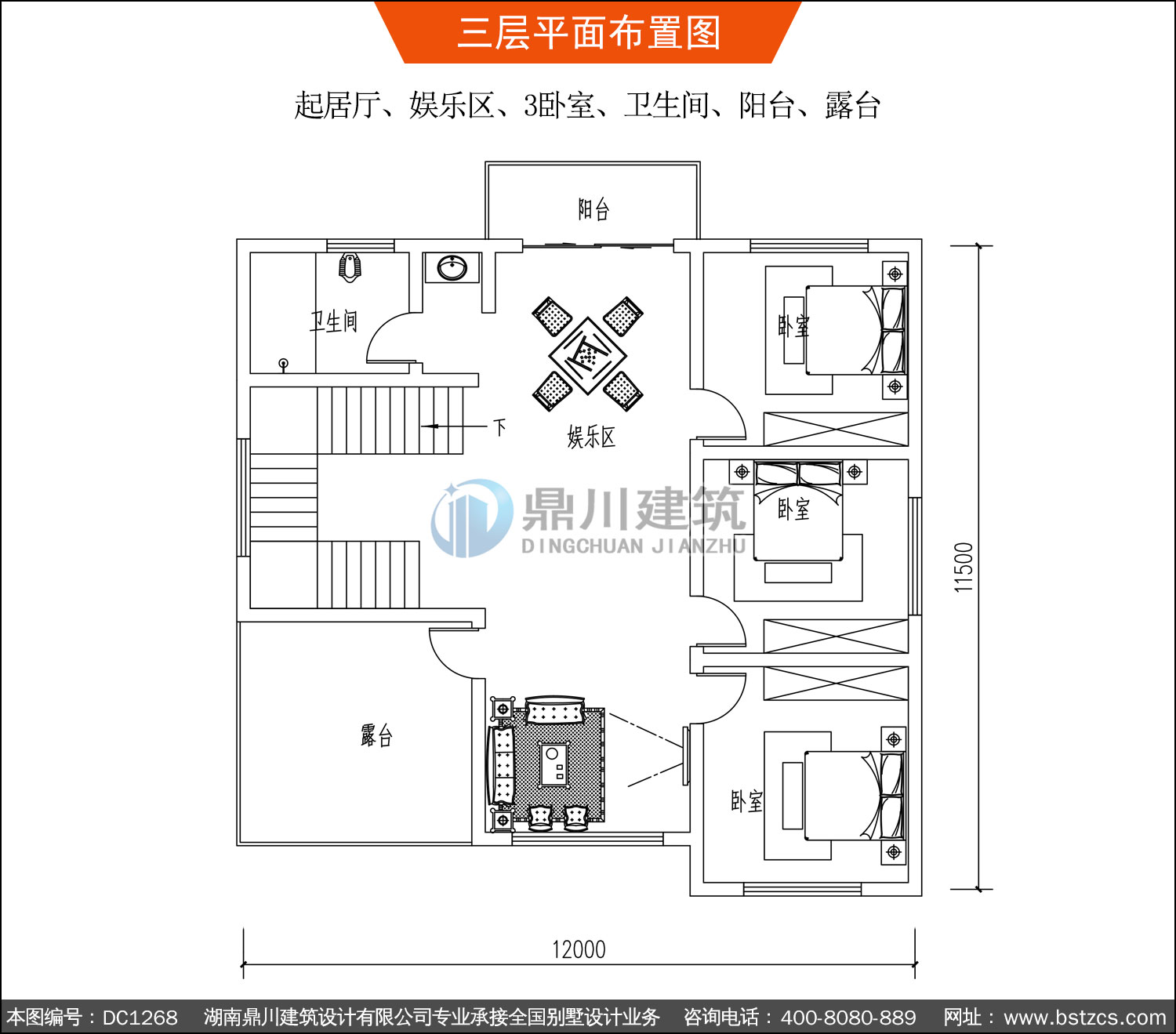 | 三 層: | 起居室、娛樂區、3臥室、衛生間、陽臺、露臺 | |||