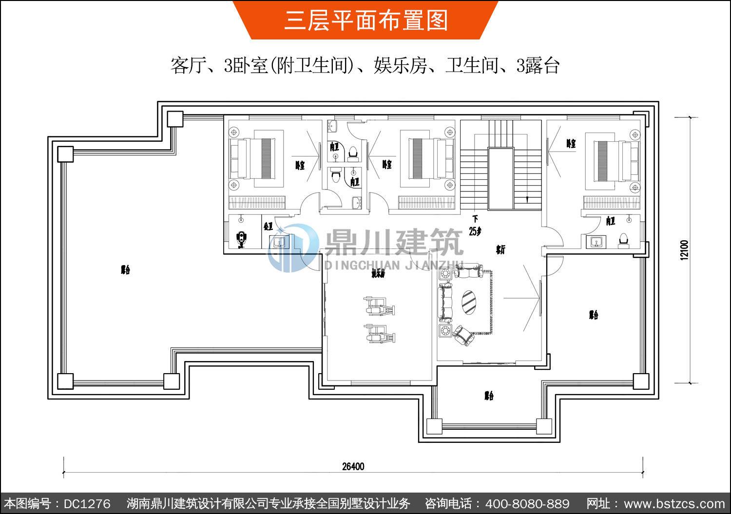 | 三 層: | 客廳、3臥室(附衛生間)、娛樂房、衛生間、3露臺 | |||
