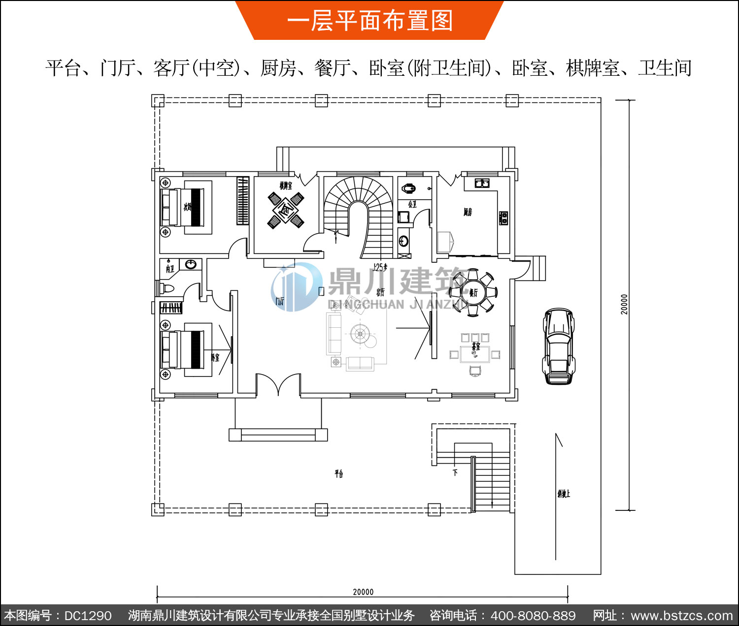 | 一 層: | 平臺、門廳、客廳(中空)、廚房、餐廳、臥室(附衛(wèi)生間)、臥室、棋牌室、衛(wèi)生間 | |||