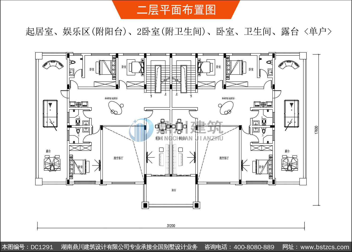 | 二 層: | 起居室、娛樂區(qū)(附陽臺)、臥室(附衛(wèi)生間)、臥室、衛(wèi)生間、露臺 <單戶> | |||