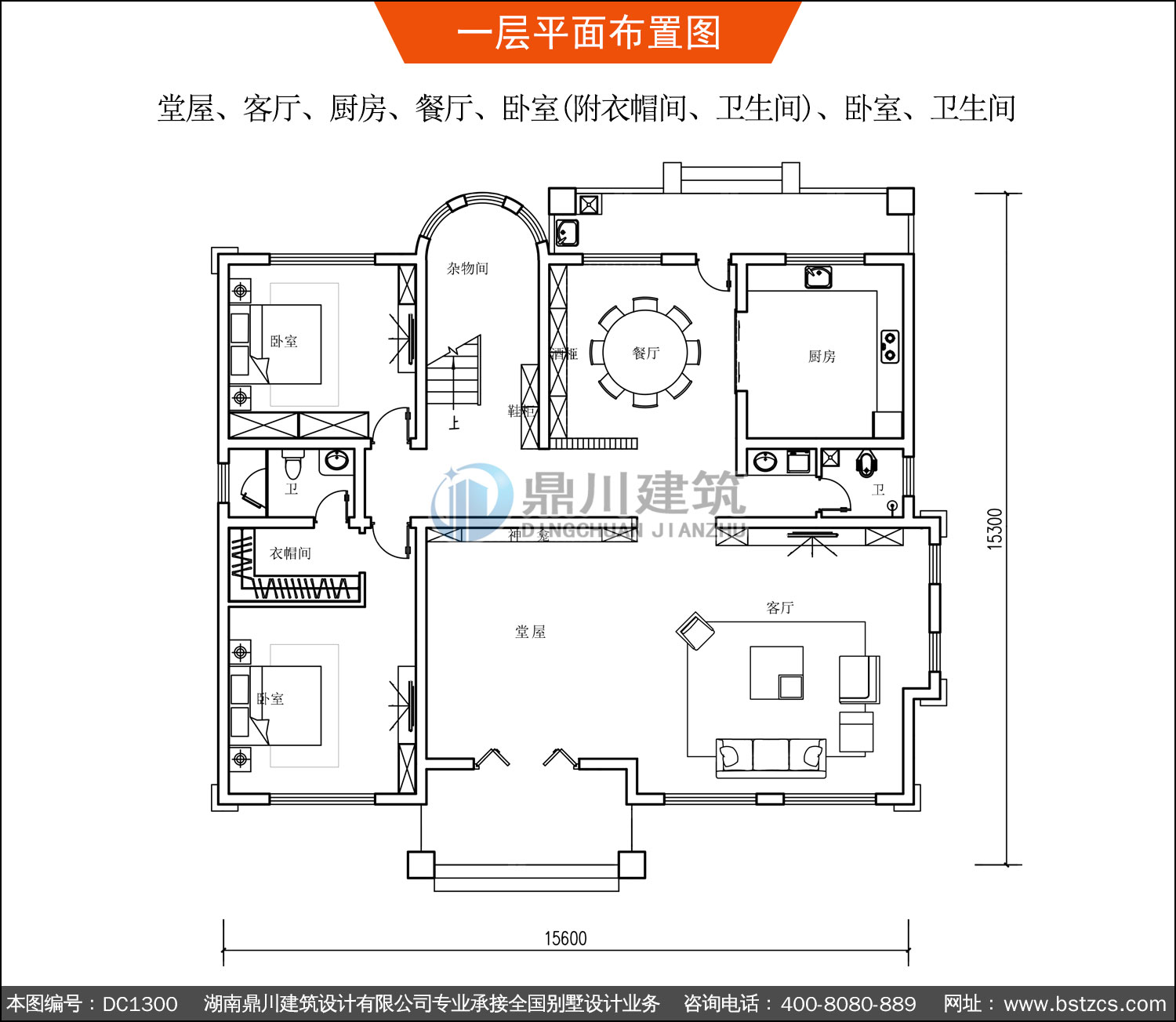 | 一 層: | 堂屋、客廳、廚房、餐廳、臥室(附衣帽間、衛(wèi)生間)、臥室、衛(wèi)生間 | |||