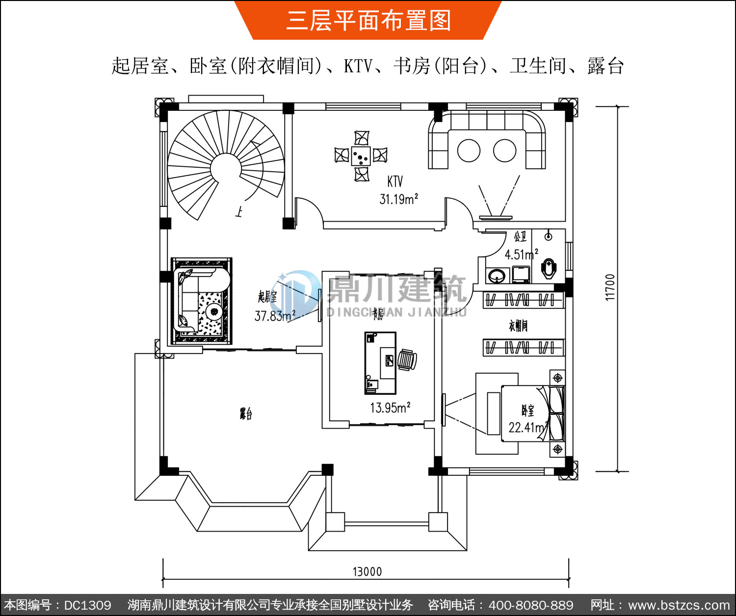 | 三 層: | 起居室、臥室(附衣帽間)、KTV、書房(陽臺)、衛生間、露臺 | |||