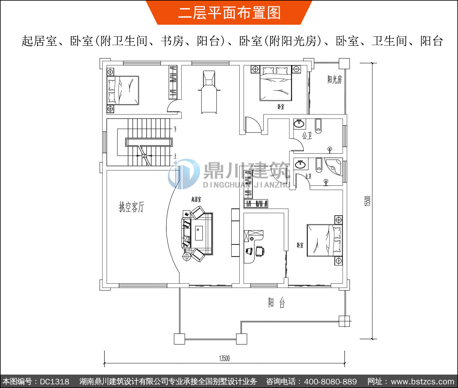 | 二 層: | 起居室、臥室(附衛生間、書房、陽臺)、臥室(附陽光房)、臥室、衛生間、陽臺 | |||