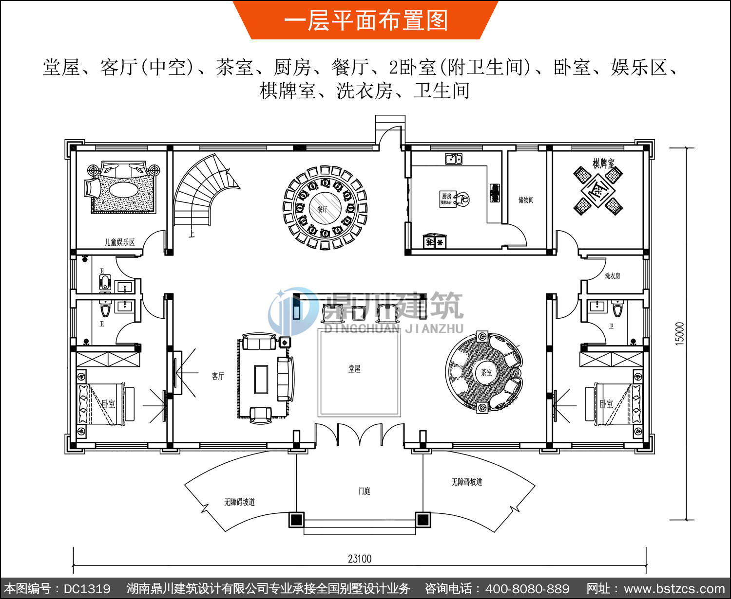 | 一 層: | 堂屋、客廳(中空)、茶室、廚房、餐廳、2臥室(附衛生間)、臥室、娛樂區、棋牌室、洗衣房、衛生間 | |||