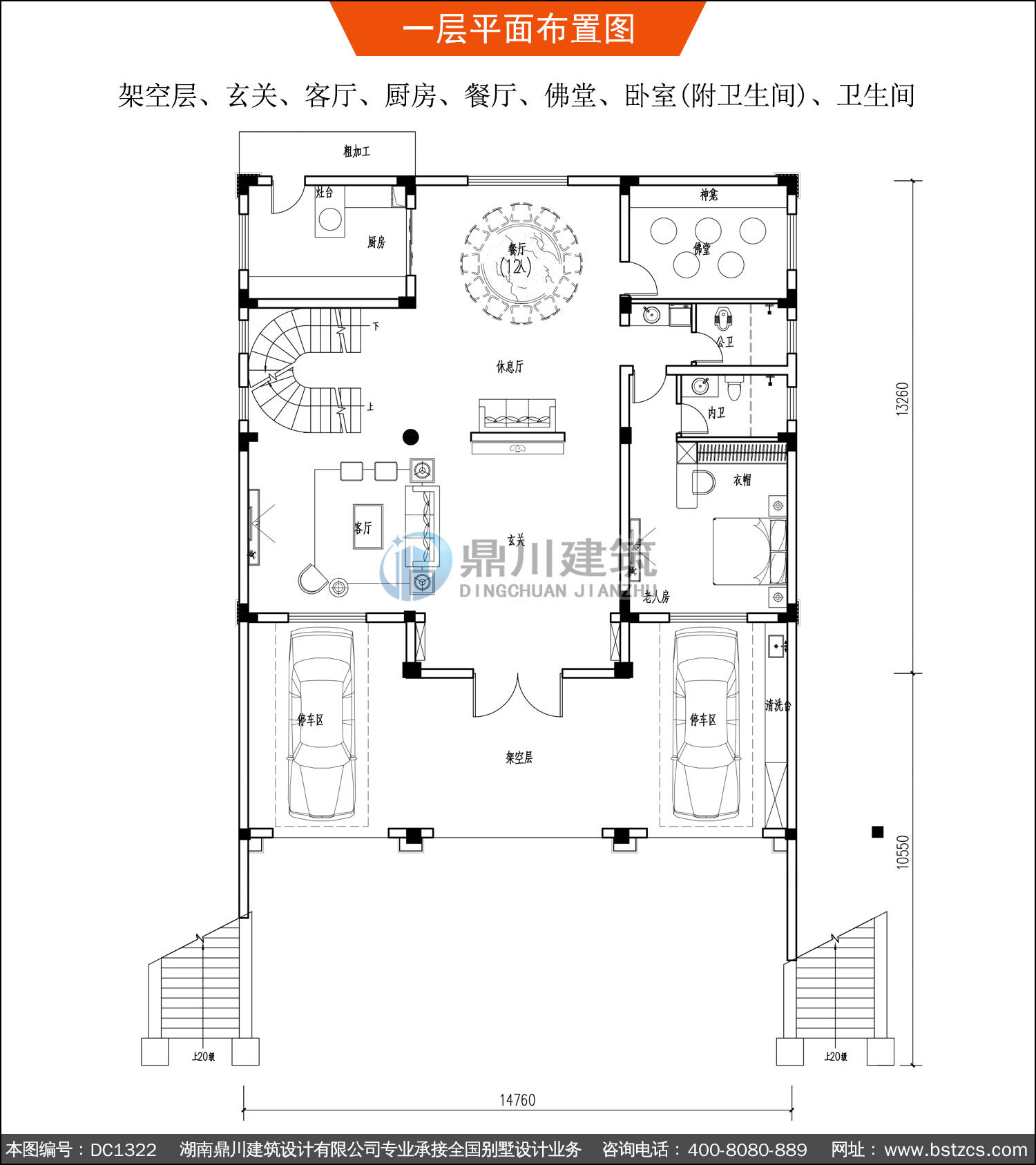 | 一 層: | 架空層、玄關、客廳、廚房、餐廳、佛堂、臥室(附衛生間)、衛生間 | |||