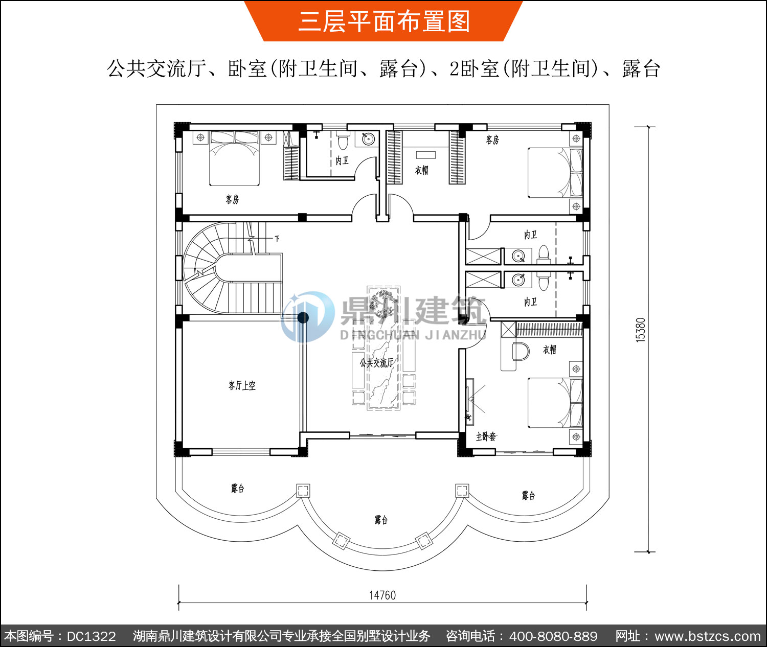 | 三 層: | 公共交流廳、臥室(附衛生間、露臺)、2臥室(附衛生間)、露臺 | |||