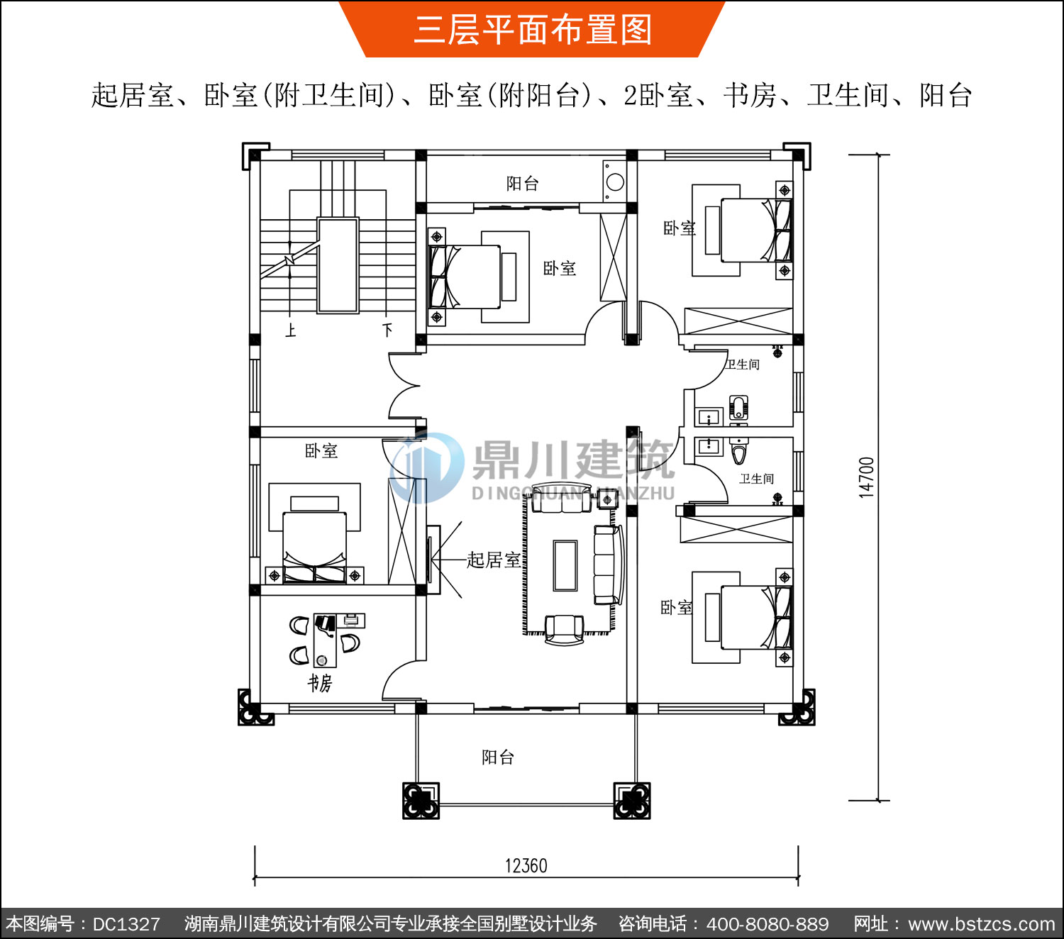 | 三 層: | 起居室、臥室(附衛生間)、臥室(附陽臺)、2臥室、書房、衛生間、陽臺 | |||