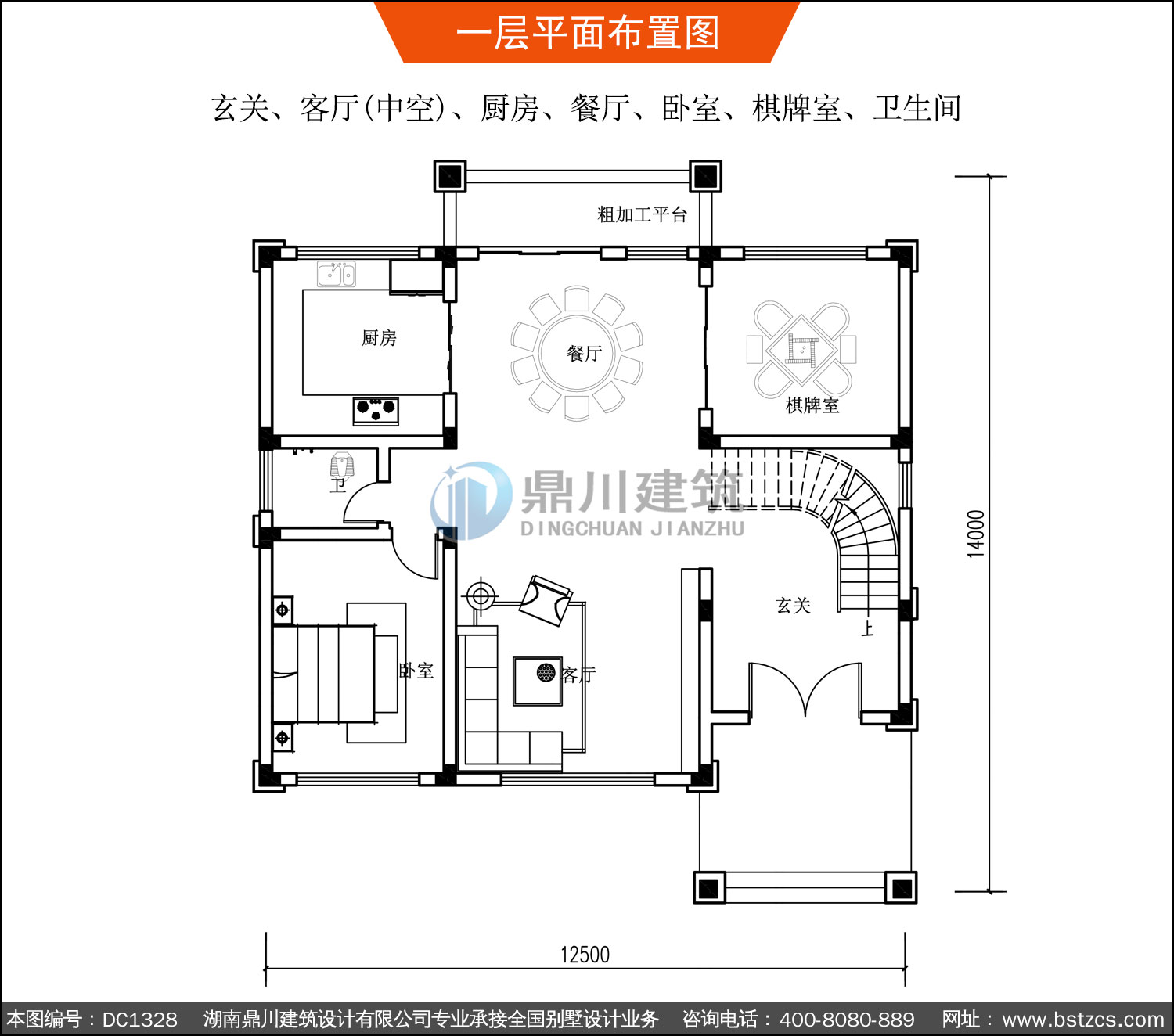 | 一 層: | 玄關、客廳(中空)、廚房、餐廳、臥室、棋牌室、衛生間 | |||