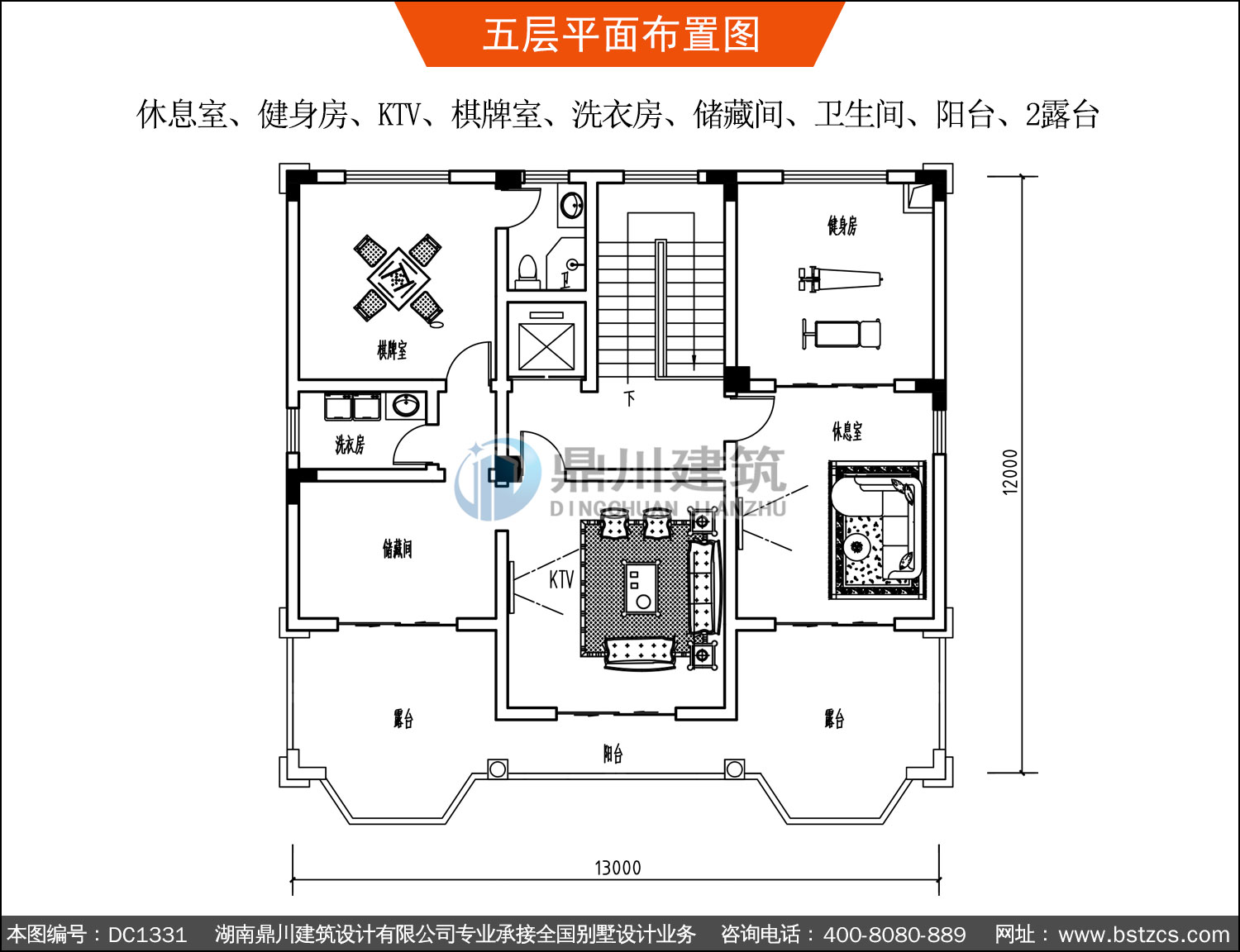 | 五 層: | 休息室、健身房、KTV、棋牌室、洗衣房、儲藏間、衛(wèi)生間、陽臺、2露臺 | |||