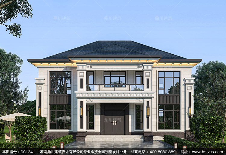 大氣新中式二層帶車庫別墅圖紙及效果圖_農村自建別墅設計,鼎川