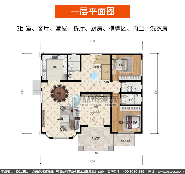 | 一 層: | 2臥室、客廳、堂屋、餐廳、廚房、棋牌區、內衛、洗衣房 | |||