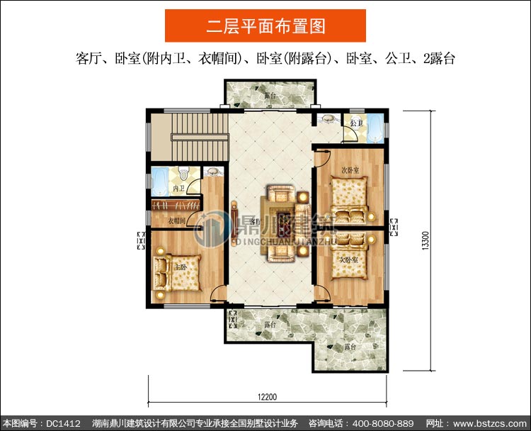 | 二 層: | 客廳、臥室(附內衛、衣帽間)、臥室(附露臺)、臥室、公衛、2露臺 | |||