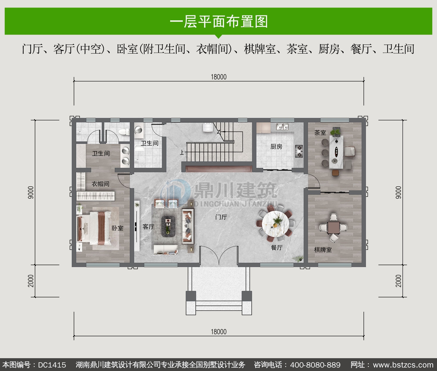 | 一 層: | 門廳、客廳(中空)、臥室(附衛生間、衣帽間)、棋牌室、茶室、廚房、餐廳、衛生間 | |||