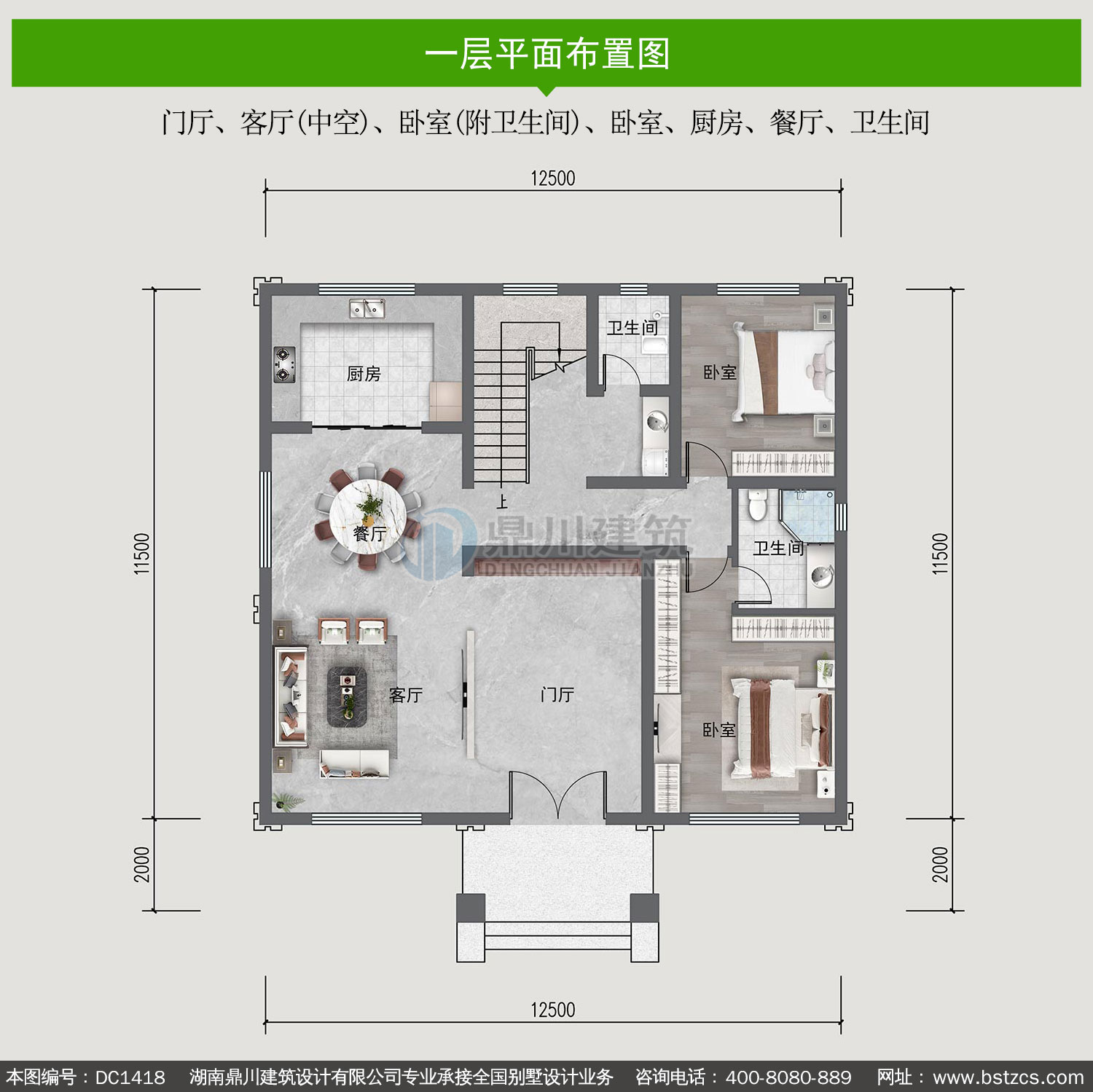 | 一 層: | 門廳、客廳(中空)、臥室(附衛生間)、臥室、廚房、餐廳、衛生間 | |||