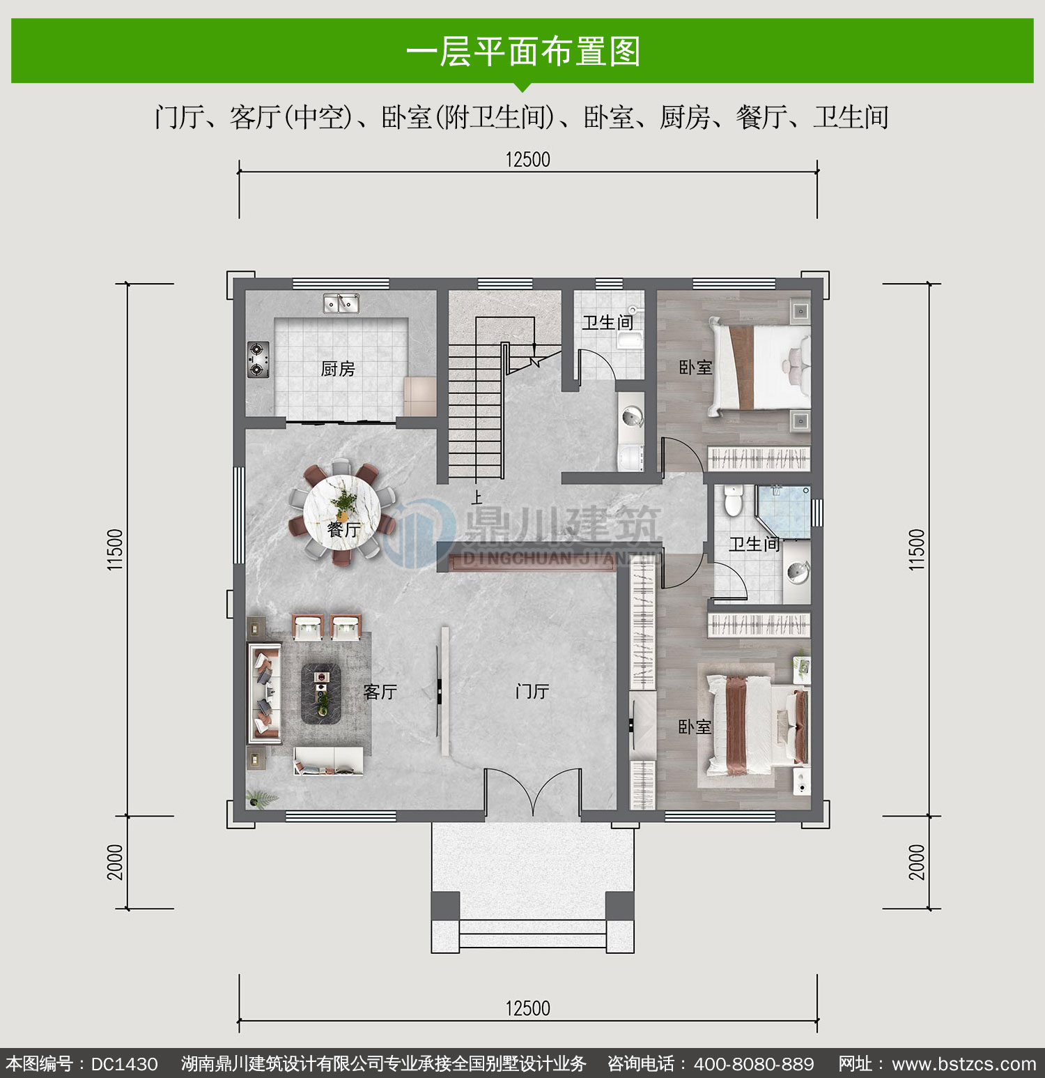 | 一 層: | 門廳、客廳(中空)、臥室(附衛(wèi)生間)、臥室、廚房、餐廳、衛(wèi)生間 | |||