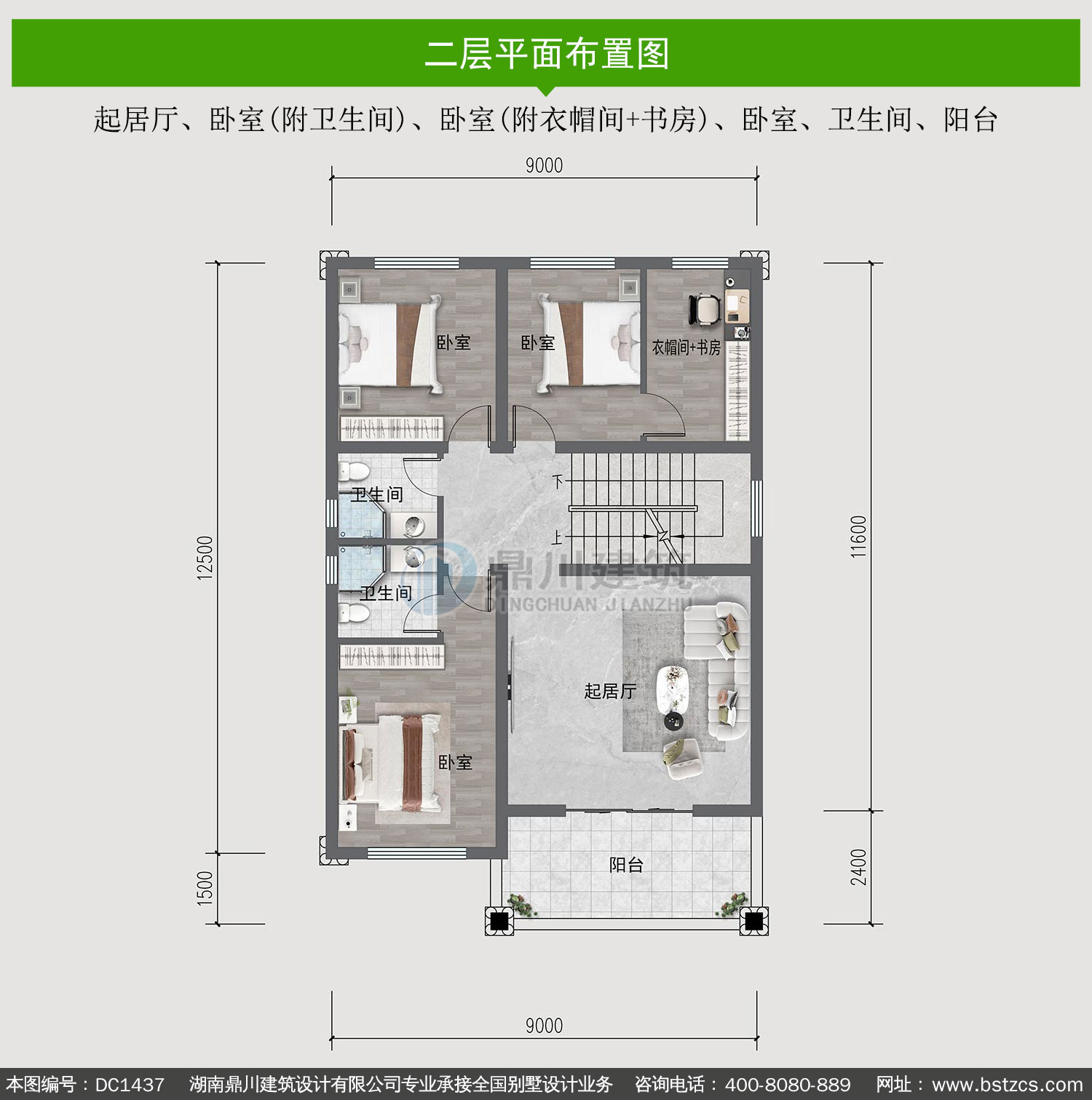 | 二 層: | 起居廳、臥室(附衛(wèi)生間)、臥室(附衣帽間+書房)、臥室、衛(wèi)生間、陽臺(tái) | |||