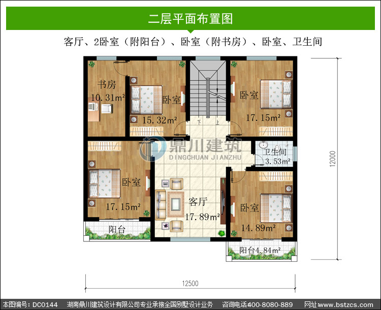 | 二 層: | 客廳、2臥室(附陽臺)、臥室(附書房)、臥室、衛生間 | |||