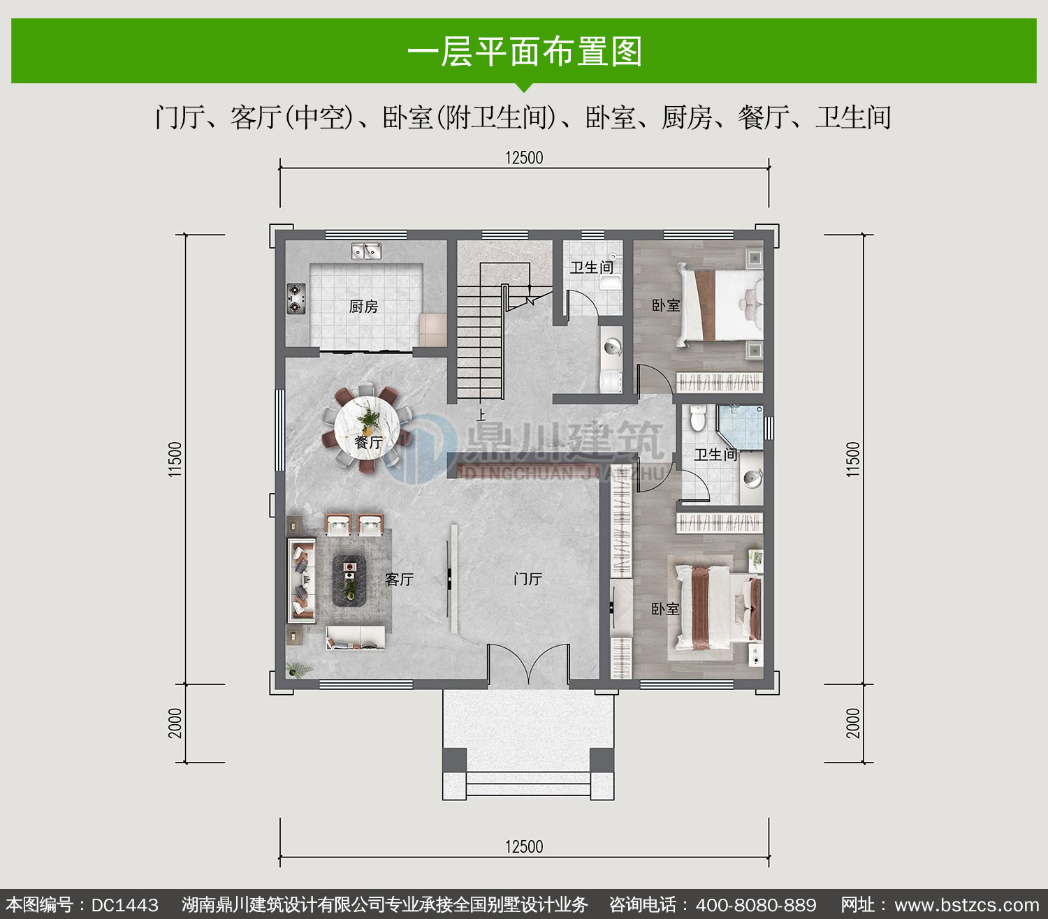 | 一 層: | 門廳、客廳(中空)、臥室(附衛(wèi)生間)、臥室、廚房、餐廳、衛(wèi)生間 | |||