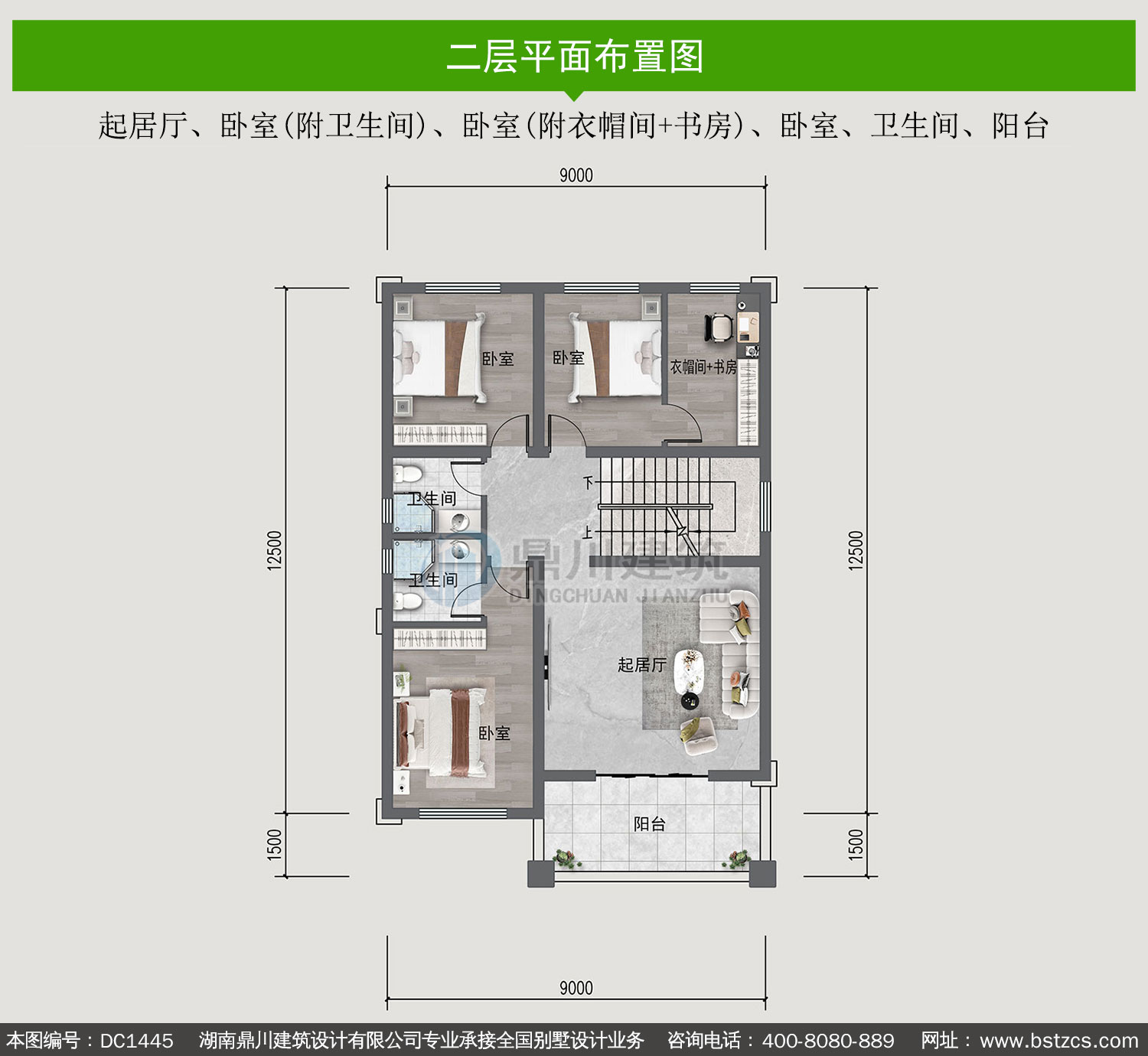 | 二 層: | 起居廳、臥室(附衛(wèi)生間)、臥室(附衣帽間+書房)、臥室、衛(wèi)生間、陽(yáng)臺(tái) | |||