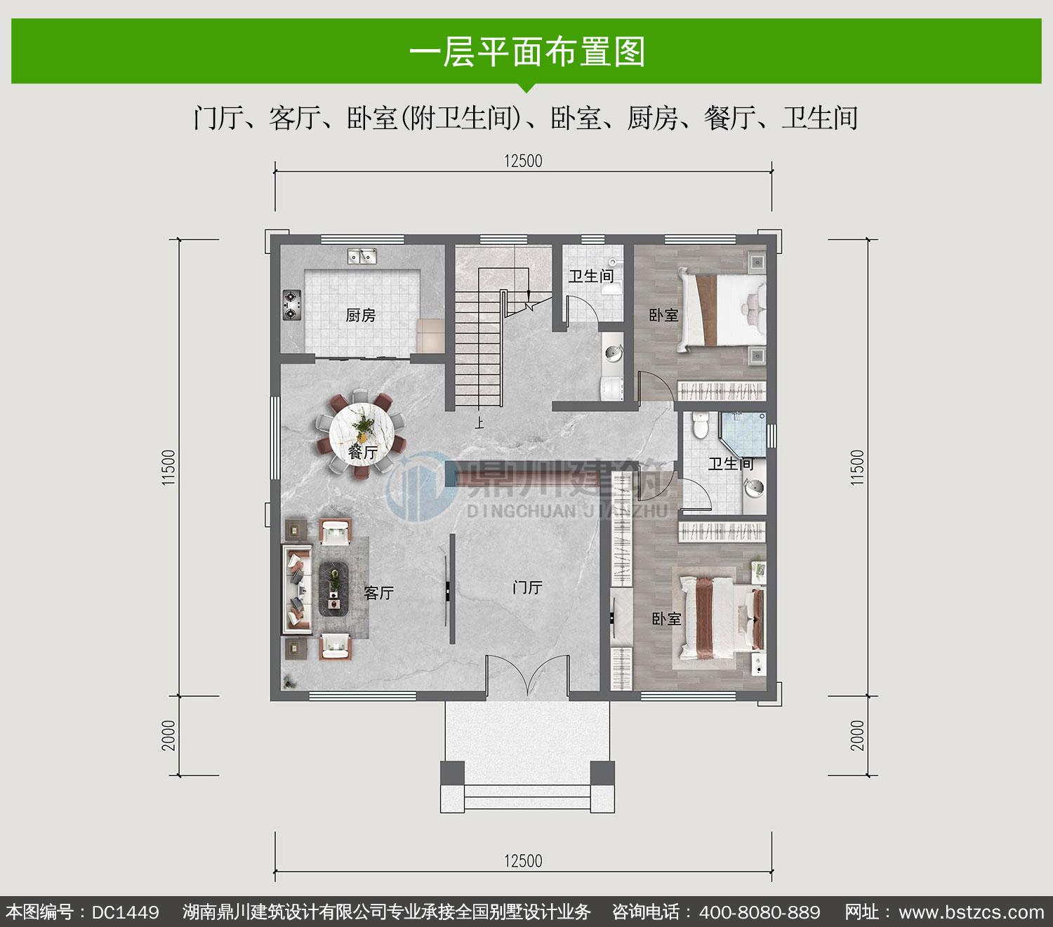 | 一 層: | 門廳、客廳、臥室(附衛生間)、臥室、廚房、餐廳、衛生間 | |||