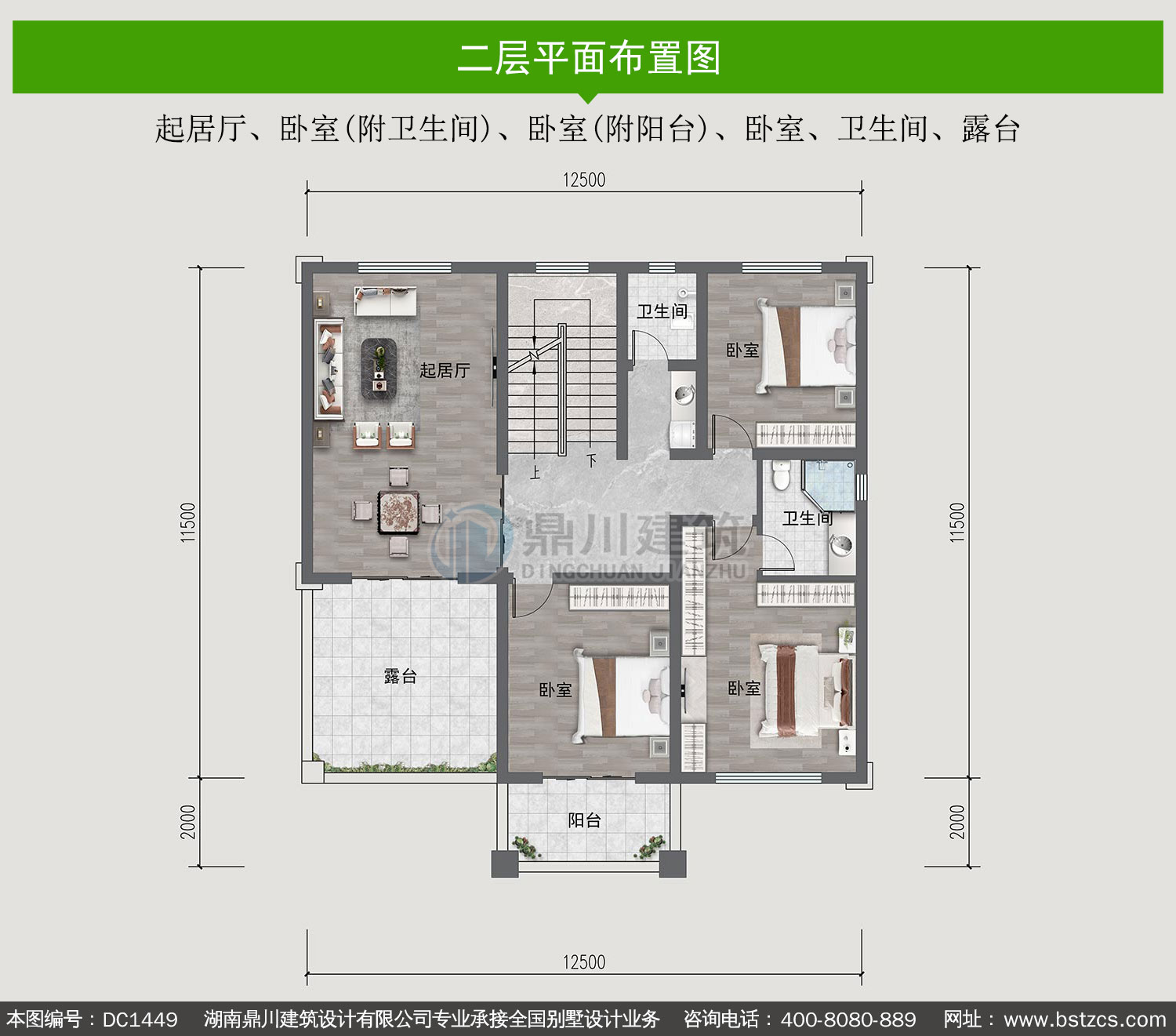 | 二 層: | 起居廳、臥室(附衛生間)、臥室(附陽臺)、臥室、衛生間、露臺 | |||