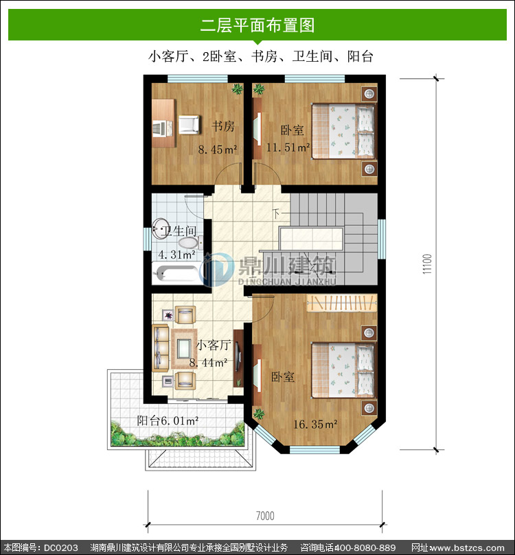 | 二 層: | 小客廳、2臥室、書房、衛生間、陽臺 | |||